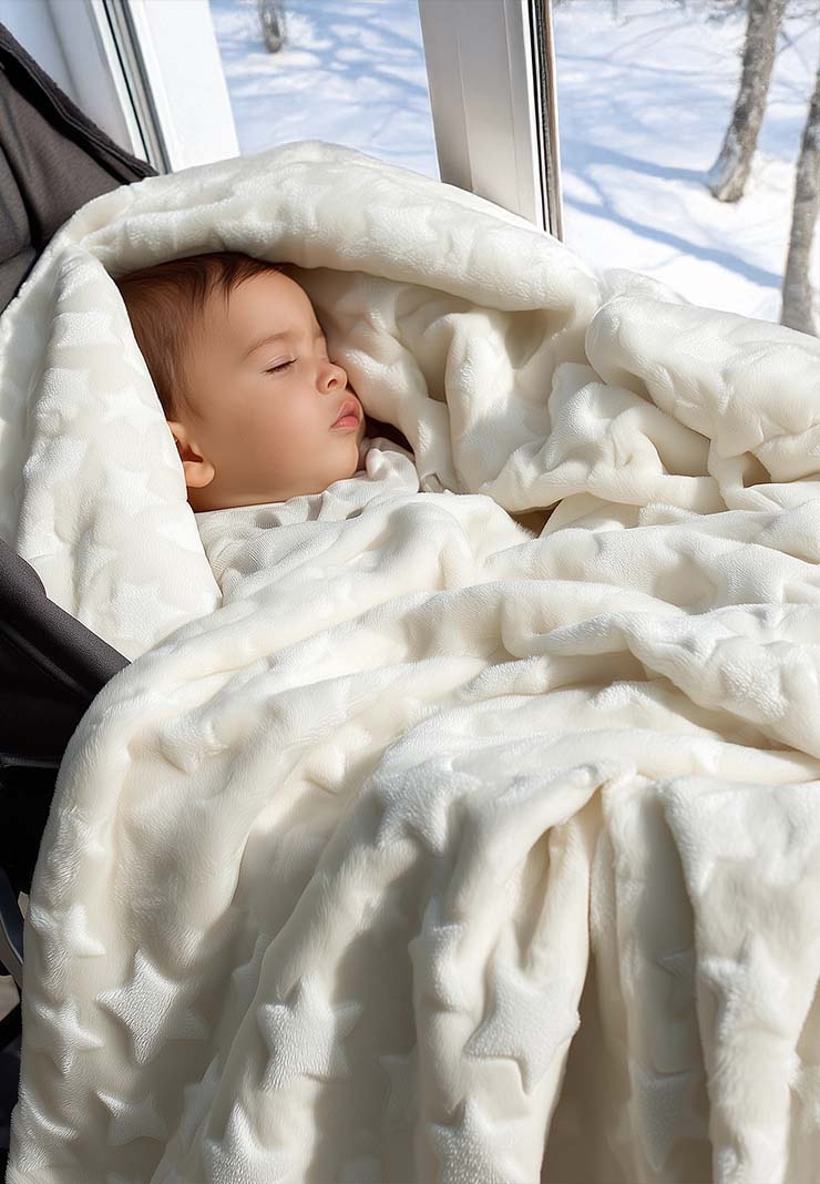 Очень милый плед! Взяли его на выписку дочке! Приятный звездный принт внутри и мягкий молочный плющ снаружи! Сейчас укрываем дочку этим пледом