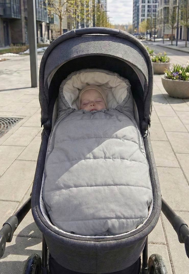 - Глубокий капюшон затягивается, плотно прилегая к головке малыша